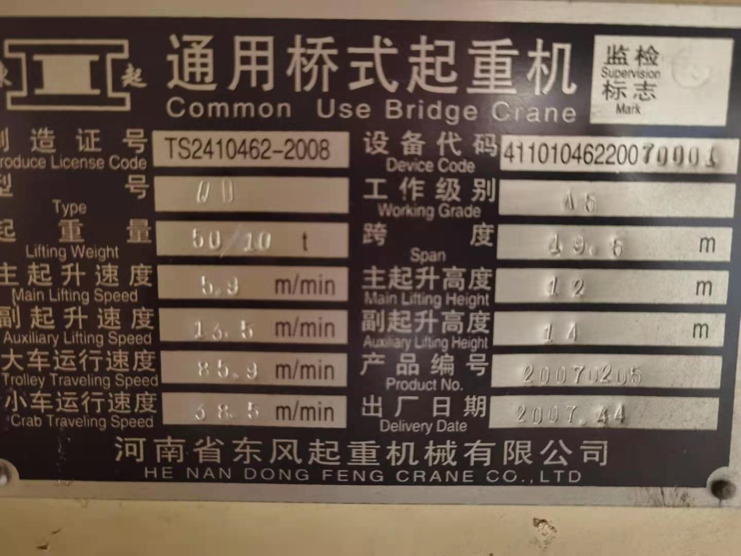 QD50/10吨 75/20吨 80/20吨各一台 跨度34米桥式行车