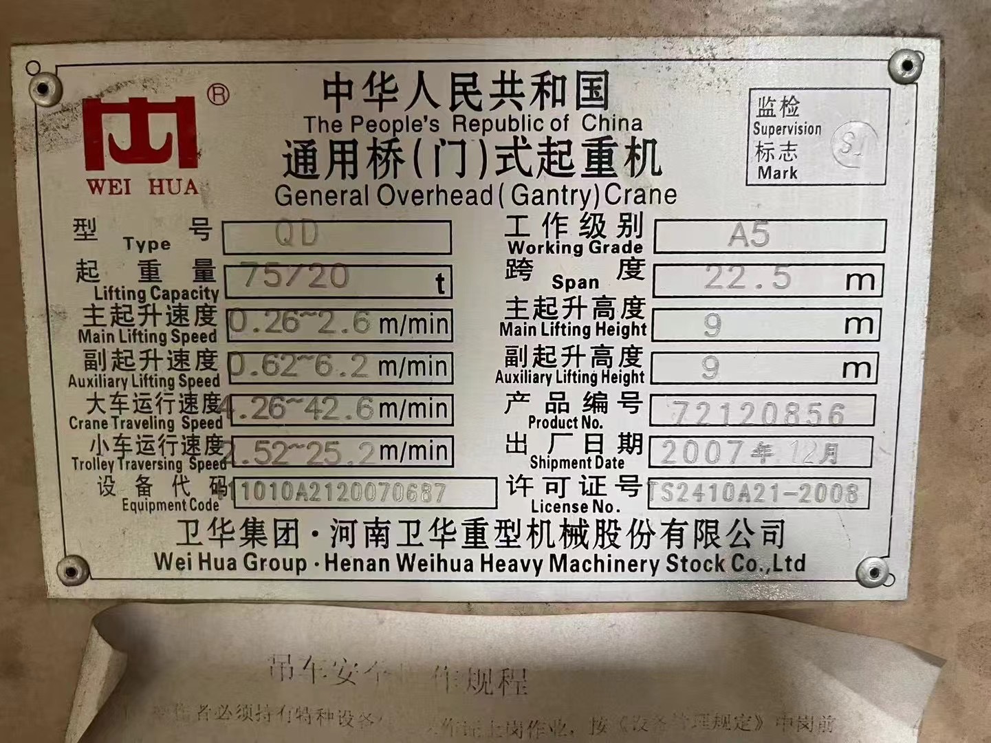 QD双梁桥式行车 75/20吨 跨度22.5米 3台
