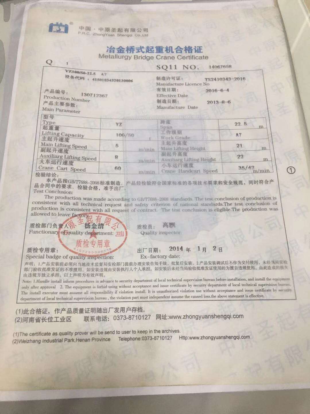 低价出售二手YZ100/50吨22.5米跨度冶金桥式行车,2014年中原产的车,八成新,欢迎光临选购。